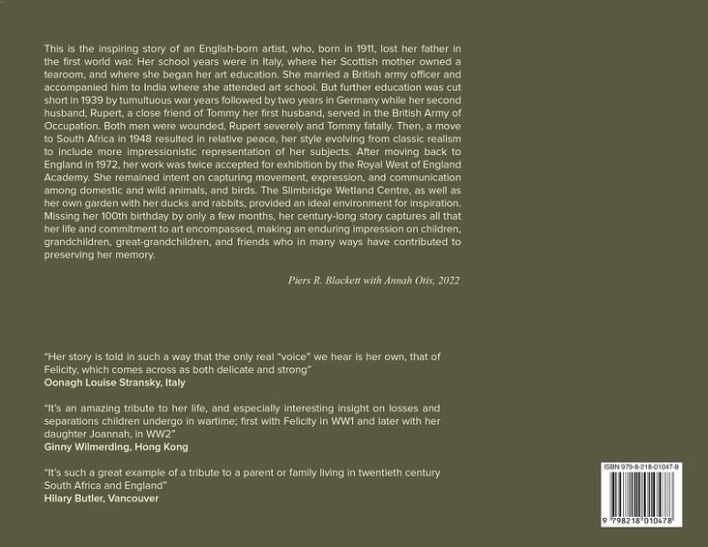 A biography of Felicity Blackett (1912-2011), an English artist, supplemented by her own diaries, begins with her birth in Liverpool where her Scottish mother married a detective who became head of the Criminal Investigation Department. At the age of four, she was saddened by her father's death in the Battle of the Somme in 1916. After the war, Felicity and her mother immigrated to Italy where she had art lessons from Barbara Nash, sister of the well-known war artist brothers. Returning to England just before the war, ventures included marriage, motherhood, divorce, and a second marriage, all while working in the Voluntary Aid Detachment (VAD), caring for wounded soldiers, including her second husband. After World War II, Felicity began with consolidating her artistic talents over twenty-five years in South Africa and then four decades in England where she settled in the Cotswold Village of Dursley, staying in close touch with her extended family and friends including her American daughter and family. While in England her art was influenced by the surrounding countryside, villages, and animals especially wildfowl and scenic habitats in Gloucestershire and on visits to the Scottish border country.