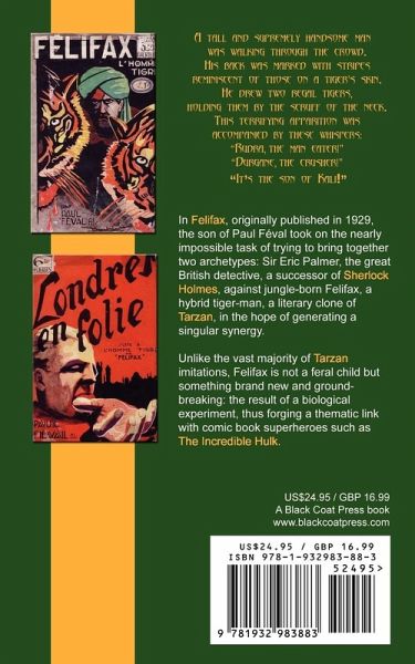 In Felifax, originally published in 1929, the son of Paul Féval took on the nearly impossible task of trying to bring together two archetypes: Sir Eric Palmer, the great British detective, a successor of Sherlock Holmes, against jungle-born Felifax, a hybrid tiger-man, a literary clone of Tarzan, in the hope of generating a singular synergy. Unlike the vast majority of Tarzan imitations, Felifax is not a feral child but something brand new and ground-breaking: the result of a biological experiment, thus forging a thematic link with comic book superheroes such as The Incredible Hulk.