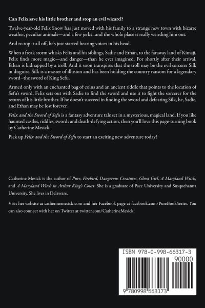 Can Felix save his little brother and stop an evil wizard? Twelve-year-old Felix Snow has just moved with his family to a strange new town with bizarre weather, peculiar animals—and a few jerks—and the whole place is really weirding him out. And to top it all off, he's just started hearing voices in his head. When a freak storm whisks Felix and his siblings, Sadie and Ethan, to the faraway land of Kimaji, Felix finds more magic—and danger—than he ever imagined. For shortly after their arrival, Ethan is kidnapped by a troll. And it soon transpires that the troll may be the evil sorcerer Silk in disguise. Silk is a master of illusion and has been holding the country ransom for a legendary sword—the sword of King Sefu. Armed only with an enchanted bag of coins and an ancient riddle that points to the location of Sefu's sword, Felix sets out with Sadie to find the sword and use it to fight the sorcerer for the return of his little brother. If he doesn't succeed in finding the sword and defeating Silk, he, Sadie, and Ethan may be lost forever. Felix and the Sword of Sefu is a fantasy adventure tale set in a mysterious, magical land. If you like haunted castles, riddles, swords, and death-defying action, then you'll love this page-turning book by Catherine Mesick. Pick up Felix and the Sword of Sefu to start an exciting new adventure today!