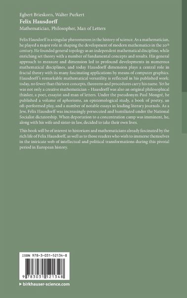 Felix Hausdorff is a singular phenomenon in the history of science. As a mathematician, he played a major role in shaping the development of modern mathematics in the 20th century. He founded general topology as an independent mathematical discipline, while enriching set theory with a number of fundamental concepts and results. His general approach to measure and dimension led to profound developments in numerous mathematical disciplines, and today Hausdorff dimension plays a central role in fractal theory with its many fascinating applications by means of computer graphics. Hausdorff 's remarkable mathematical versatility is reflected in his published work: today, no fewer than thirteen concepts, theorems and procedures carry his name. Yet he was not only a creative mathematician - Hausdorff was also an original philosophical thinker, a poet, essayist and man of letters. Under the pseudonym Paul Mongré, he published a volume of aphorisms, an epistemological study, abook of poetry, an oft-performed play, and a number of notable essays in leading literary journals. As a Jew, Felix Hausdorff was increasingly persecuted and humiliated under the National Socialist dictatorship. When deportation to a concentration camp was imminent, he, along with his wife and sister-in law, decided to take their own lives. This book will be of interest to historians and mathematicians already fascinated by the rich life of Felix Hausdorff, as well as to those readers who wish to immerse themselves in the intricate web of intellectual and political transformations during this pivotal period in European history.