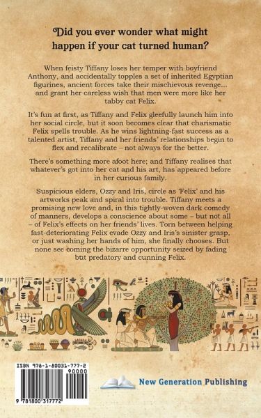 Did you ever wonder what might happen if your cat turned human? When feisty Tiffany loses her temper with boyfriend Anthony, and accidentally topples a set of inherited Egyptian figurines, ancient forces take their mischievous revenge...and grant her careless wish that men were more like her tabby cat Felix. It's fun at first, as Tiffany and Felix gleefully launch him into her social circle, but it soon becomes clear that charismatic Felix spells trouble. As he wins lightning-fast success as a talented artist, Tiffany and her friends' relationships begin to flex and recalibrate - not always for the better. There's something more afoot here; and Tiffany realises that whatever's got into her cat and his art, has appeared before in her curious family. Suspicious elders, Ozzy and Iris, circle as 'Felix' and his artworks peak and spiral into trouble. Tiffany meets a promising new love and, in this tightly-woven dark comedy of manners, develops a conscience about some - but not all - of Felix's effects on her friends' lives. Torn between helping fast-deteriorating Felix evade Ozzy and Iris's sinister grasp, or just washing her hands of him, she finally chooses. But none see coming the bizarre opportunity seized by fading but predatory and cunning Felix.