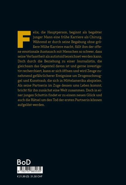 Felix, die Hauptperson, beginnt als begabter junger Mann eine frühe Karriere als Chirurg. Während er durch seine Begabung ohne größere Mühe Karriere macht, fällt ihm der offene emotionale Austausch mit Menschen so schwer, dass seine Verfasstheit als autistoid bezeichnet werden kann. Doch durch die Beziehung zu einer Journalistin, die gleichsam das Gegenteil davon ist und gerne investigativ recherchiert, kann er sich öffnen und wird Zeuge zunehmend gefährlicherer Ereignisse um Drogenschmuggel und Kunstraub, die sich in Mittelamerika abspielen. Als seine Partnerin im Zuge dessen ums Leben kommt, bricht für ihn zunächst eine Welt zusammen. Doch in einer jungen Schottin findet er zu einem neuen Glück und auch die Rätsel um den Tod der ersten Partnerin können aufgelöst werden.