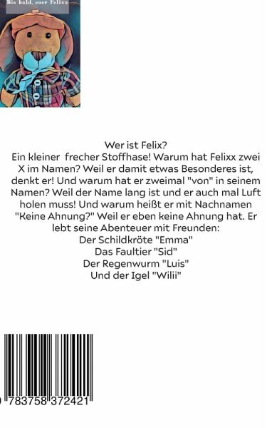 Wer ist Felixx?Ein kleiner frecher Stoffhase!Warum hat Felixx zwei X im Namen?Weil er damit etwas Besonderes ist, denkt er!Und warum hat er zweimal "von" in seinem Namen?Weil der Name lang ist und er auch mal Luft holen muss!Und warum heißt er mit Nachnamen "Keine Ahnung?"Weil er eben keine Ahnung hat!Er erlebt seine Abenteuer mit Freunden:Der Schildkröte "Emma"Dem Faultier "Sid"Dem Regenwurm "Luis"Und dem Igel "Willi"