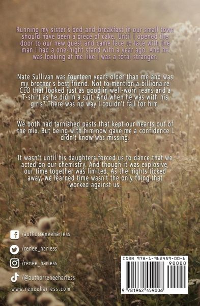 Running my sister's bed-and-breakfast in our small town should have been a piece of cake. Until I opened the door to our new guest and came face to face with the man I had a one-night stand with a year ago. And he was looking at me like I was a total stranger. Nate Sullivan was fourteen years older than me and was my brother's best friend. Not to mention a billionaire CEO that looked just as good in well-worn jeans and a T-shirt as he did in a suit. And when he was with his girls? There was no way I couldn't fall for him. We both had tarnished pasts that kept our hearts out of the mix. But being with him now gave me a confidence I didn't know was missing. It wasn't until his twin daughters forced us to dance that we acted on our chemistry. And though it was explosive, our time together was limited. As the nights ticked away, we learned time wasn't the only thing that worked against us. **This is book 2 in the Sunny Brook Farms Series. Each one can be read as a complete standalone. Always an HEA!**