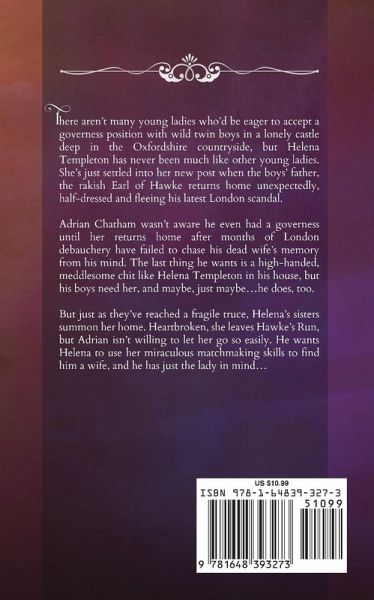 "There aren't many young ladies who'd be eager to accept a governess position with wild twin boys in a lonely castle deep in the Oxfordshire countryside, but Helena Templeton has never been much like other young ladies. She's just settled into her new post when the boys' father, the rakish Earl of Hawke returns home unexpectedly, half-dressed and fleeing his latest London scandal. Adrian Chatham wasn't aware he even had a governess until her returns home after months of London debauchery have failed to chase his dead wife's memory from his mind. The last thing he wants is a high-handed, meddlesome chit like Helena Templeton in his house, but his boys need her, and maybe, just maybe...he does, too. But just as they've reached a fragile truce, Helena's sisters summon her home. Heartbroken, she leaves Hawke's Run, but Adrian isn't willing to let her go so easily. He wants Helena to use her miraculous matchmaking skills to find him a wife, and he has just the lady in mind..."--Publisher.