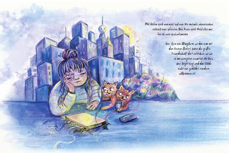 "Mit Wölfen spielt man nicht, sagt man. Sie sind wild, unberechenbar, vielleicht sogar gefährlich. Doch Rusho spürt: Nicht alles, was frei ist, muss gezähmt werden." Rusho lassen Vorurteile kalt. Auf Herz, Bauch und Verstand ist Verlass und diese eine Begegnung fühlt sich einfach zu stimmig an. Weit weg von Zeit, Raum und Stadt entsteht in wild-zärtlichen Bildern eine abenteuerliche Freundschaft.