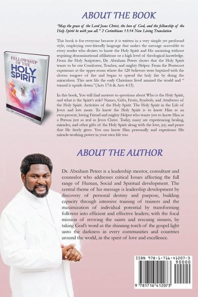 "And now I will send the Holy Spirit, just as my Father promised. But stay here in the city until the Holy Spirit comes and fills you with power from heaven." Luke 24:49 New Living Translation What is the greatest promise God ever made? Joel 2:28 And it shall come to pass afterward, that I will pour out my spirit upon all flesh; and your sons and your daughters shall prophesy, your old men shall dream dreams, your young men shall see visions: 29 And also upon the servants and upon the handmaids in those days will I pour out my spirit. 30 And I will shew wonders in the heavens and in the earth, blood, and fire, and pillars of smoke. 31 The sun shall be turned into darkness, and the moon into blood, before the great and terrible day of the Lord come. 32 And it shall come to pass, that whosoever shall call on the name of the Lord shall be delivered: for in mount Zion and in Jerusalem shall be deliverance, as the Lord hath said, and in the remnant whom the Lord shall call.(Acts 2:15-21) For all the blessings God has ever given to mankind the Holy Spirit remains one of the most integral and important. Yet many Christians struggle with unlocking the power in their lives because there is so much denominational doctrine division and differences in theology in the church. You don't have to be a spiritual leader to experience the presence of God and continue the works of Jesus on earth. All you need is a powerful divine encounter with the Holy Spirit. The Holy Spirit is mentioned 264 times in the New Testament alone, yet many believers are often confused about the role of the Third Person of the Trinity. The contents of this book are based on a thorough comprehensive biblical model for learning about the person and power of the Holy Spirit and how He can work in the lives of individuals. This book is for everyone because it is written in a very simple yet profound style, employing user-friendly language that makes the message accessible to every reader who desires to know the Holy Spirit and His anointing without requiring denominational affiliations or a high level of theological knowledge. From the Holy Scriptures, Dr. Abraham Peters shows that the Holy Spirit wants to be our Comforter, Teacher, and mighty Helper. From the Pentecost experience at the upper room where the 120 believers were baptized with the cloven tongues of fire and began to spread the holy fire by doing the miraculous. This new life the early Christians lived amazed the world and "turned it upside down."(Acts 17:6 & Acts 4:13). In this book, You will find answers to questions about Who is the Holy Spirit, and what is the Spirit's role? Names, Gifts, Fruits, Symbols, and Attributes of the Holy Spirit. Activities of the Holy Spirit. The Holy Spirit in the Life of Jesus and lots more. To know the Holy Spirit is to know Him as an ever-present, loving Friend and mighty Helper who wants you to know Him as a Person just as real as Jesus Christ. Today, many are experiencing healing, miracles, and other gifts of the Holy Spirit along with the love, joy, and peace that He freely gives. You can know Him personally and experience His miracle-working power in your own life too. When was the last time you had a supernatural encounter with the Holy Spirit? In this book Dr. Abraham Peters teaches you why God wants to communicate with us, how God gets our attention, how God communicates with us, and how to listen to God and enjoy His loving presence. Learning to listening to the God who wants to speak to you. His voice waits to be heard and, having heard it, we are launched into the greatest, most exciting adventure we could ever imagine..
