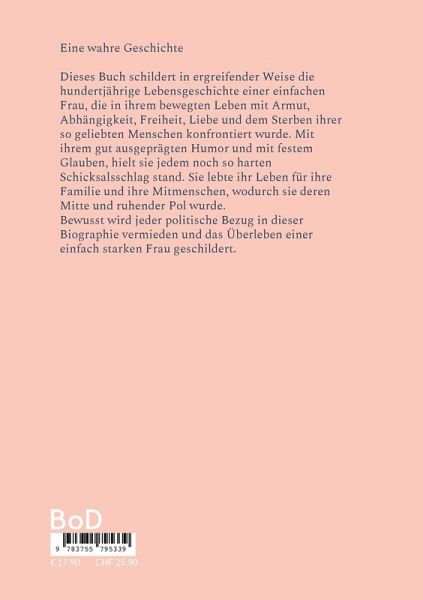 Eine wahre GeschichteDieses Buch schildert in ergreifender Weise die hundertjährige Lebensgeschichte einer einfachen Frau, die in ihrem bewegten Leben mit Armut, Abhängigkeit, Freiheit, Liebe und dem Sterben ihrer so geliebten Menschen konfrontiert wurde. Mit ihrem gut ausgeprägten Humor und mit festem Glauben, hielt sie jedem noch so harten Schicksalsschlag stand. Sie lebte ihr Leben für ihre Familie und ihre Mitmenschen, wodurch sie deren Mitte und ruhender Pol wurde.Bewusst wird jeder politische Bezug in dieser Biographie vermieden und das Überleben einer einfach starken Frau geschildert.