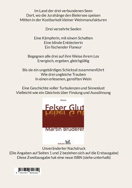 Im Land der drei verbundenen SeenDort, wo die Jurahänge den Bielersee speisenMitten in der Kostbarkeit kleiner WeinmanufakturenDrei versehrte SeelenEine Kämpferin, mit einem SchattenEine blinde EntdeckerinEin fischender FlaneurBegegnen alle drei auf ihre Weise ihrem LosEnergisch, ergeben, gleichgültigBis sie ein ungebärdiges Schicksal zusammenführtWie drei ungleiche TraubenIn einen erlesenen, gereiften WeinEine Geschichte voller Turbulenzen und SinneslustVielleicht wie ein Gleichnis über Findung und Aussöhnung
