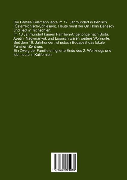 Die Familie Felsmann lebte im 17. Jahrhundert in Benisch (Österreichisch-Schlesien). Heute heißt der Ort Horni Benesov und liegt in Tschechien. Im 18 Jahrhundert kamen Familien-Angehörige nach Buda. Apatin, Nagymanyok und Lugosch waren weitere Wohnorte. Seit dem 19. Jahrhundert ist jedoch Budapest das lokale Familien-Zentrum. Ein Zweig der Familie emigrierte Ende des 2. Weltkriegs und lebt heute in Kalifornien.