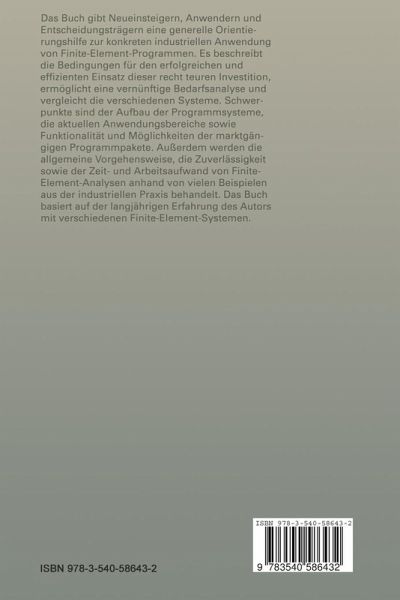 Das Buch gibt Neueinsteigern, Anwendern und Entscheidungsträgern eine generelle Orientierungshilfe zur konkreten industriellen Anwendung von Finite-Element-Programmen. Es beschreibt die Bedingungen für den erfolgreichen und effizienten Einsatz dieser recht teuren Investition, ermöglicht eine vernünftige Bedarfsanalyse und vergleicht die verschiedenen Systeme. Schwerpunkte sind der Aufbau der Programmsysteme, die aktuellen Anwendungsbereiche sowie Funktionalität und Möglichkeiten der marktgängigen Programmpakete. Außerdem werden die allgemeine Vorgehensweise, die Zuverlässigkeit sowie der Zeit- und Arbeitsaufwand von Finite-Element-Analysen anhand von vielen Beispielen aus der indiustriellen Praxis behandelt. Das Buch basiert auf der langjährigen Erfah