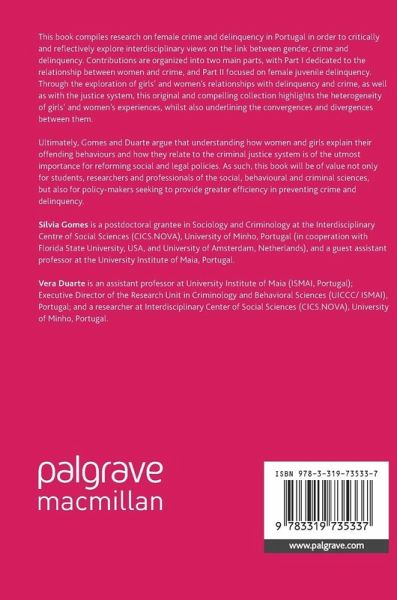 Chapter 1. An Introduction to Female Crime and Delinquency; Sílvia Gomes and Vera Duarte.- Part I - Crime and Women.- Chapter 2. The Criminal Act at the Core of the Nexus Security-insecurity; Catarina Frois.- Chapter 3. Stalking by Women; Helena Grangeia and Margarida Santos.- Chapter 4. Onstage and off; Manuela Ivone Cunha.- Chapter 5. How do Foreign Women end up in Prison?; Sílvia Gomes.- Chapter 6. 'To Kill or to be Killed'; Mafalda Ferreira, Sofia Neves and Sílvia Gomes.- Part II - Female Juvenile Delinquency.- Chapter 7. Heterosexual Dating Violence and Social Gender Relations; Sofia Neves and Joana Torres.- Chapter 8. Constructing Meaning about the Delinquency of Young Girls in Public Housing Neighbourhoods; Maria João Leote de Carvalho.- Chapter 9. Gender and Crime in the Life Pathways of Young Women Offenders; Raquel Matos.- Chapter 10. Girls and Transgressive Paths; Vera Duarte and Ana Margarida Guerreiro.