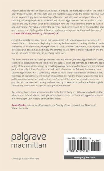 "Annie Cossins has written a remarkable book. In tracing the moral regulation of the female body through the lens of infanticide from the nineteenth century to the present day, this work fills an important gaps in understandings of female criminality and moral panic theory. In situating her analysis within an historical, social, and legal context, Cossins makes a robust case for the way in which sexed bodies underpin how the female criminal might be framed and understood. Any scholar interested in gender and crime would do well to read this book and consider the challenge that this sexed body approach poses for them and their work." - Sandra Walkate, University of Liverpool, UK