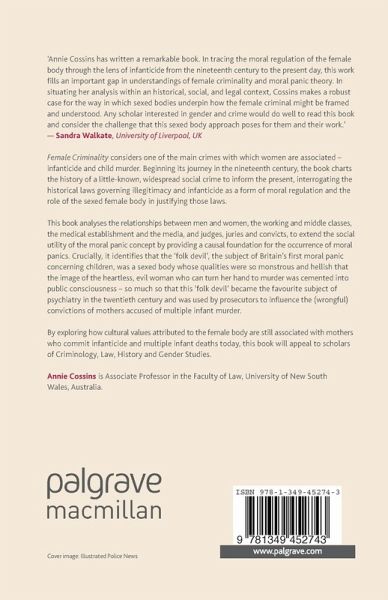 "Annie Cossins has written a remarkable book. In tracing the moral regulation of the female body through the lens of infanticide from the nineteenth century to the present day, this work fills an important gaps in understandings of female criminality and moral panic theory. In situating her analysis within an historical, social, and legal context, Cossins makes a robust case for the way in which sexed bodies underpin how the female criminal might be framed and understood. Any scholar interested in gender and crime would do well to read this book and consider the challenge that this sexed body approach poses for them and their work." - Sandra Walkate, University of Liverpool, UK