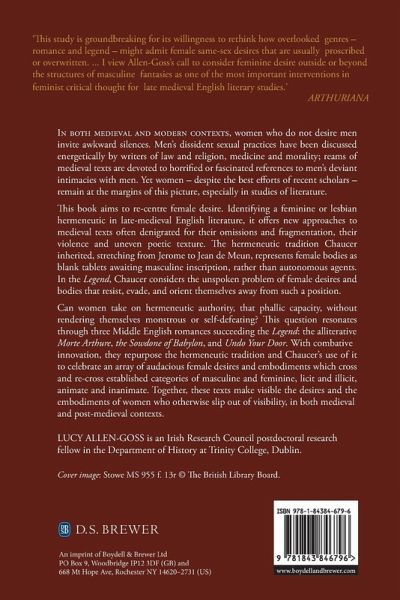 An examination of female same-sex desire in Chaucer and medieval romance. In both medieval and modern contexts, women who do not desire men invite awkward silences. Men's dissident sexual practices have been discussed energetically by writers of law and religion, medicine and morality; reams of medieval texts are devoted to horrified or fascinated references to men's deviant intimacies with men. Yet women - despite the best efforts of recent scholars - remain at the margins of this picture, especially in studies of literature. This book aims to re-centre female desire. Identifying a feminine or lesbian hermeneutic in late-medieval English literature, it offers new approaches to medieval texts often denigrated for their omissions and fragmentation, their violence and uneven poetic texture. The hermeneutic tradition Chaucer inherited, stretching from Jerome to Jean de Meun, represents female bodies as blank tablets awaiting masculine inscription, rather than autonomous agents. In the Legend, Chaucer considers the unspoken problem of female desires and bodies that resist, evade, and orient themselves away from such a position. Can women take on hermeneutic authority, that phallic capacity, without rendering themselves monstrous or self-defeating? This question resonates through three Middle English romances succeeding the Legend: the alliterative Morte Arthure, the Sowdone of Babylon, and Undo Your Door. With combative innovation, they repurpose the hermeneutic tradition and Chaucer's use of it to celebrate an array of audacious female desires and embodiments which cross and re-cross established categories of masculine and feminine, licit and illicit, animate and inanimate. Together, these texts make visible the desires and the embodiments of women who otherwise slip out of visibility, in both medieval and post-medieval contexts.