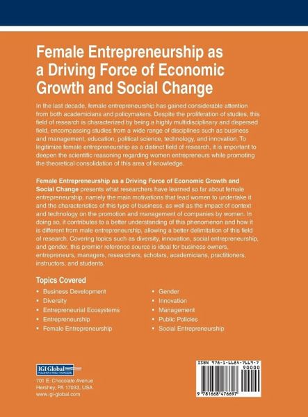 In the last decade, female entrepreneurship has gained considerable attention from both academicians and policymakers. Despite the proliferation of studies, this field of research is characterized by being a highly multidisciplinary and dispersed field, encompassing studies from a wide range of disciplines such as business and management, education, political science, technology, and innovation. To legitimize female entrepreneurship as a distinct field of research, it is important to deepen the scientific reasoning regarding women entrepreneurs while promoting the theoretical consolidation of this area of knowledge. Female Entrepreneurship as a Driving Force of Economic Growth and Social Change presents what researchers have learned so far about female entrepreneurship, namely the main motivations that lead women to undertake it and the characteristics of this type of business, as well as the impact of context and technology on the promotion and management of companies by women. In doing so, it contributes to a better understanding of this phenomenon and how it is different from male entrepreneurship, allowing a better delimitation of this field of research. Covering topics such as diversity, innovation, social entrepreneurship, and gender, this premier reference source is ideal for business owners, entrepreneurs, managers, researchers, scholars, academicians, practitioners, instructors, and students.