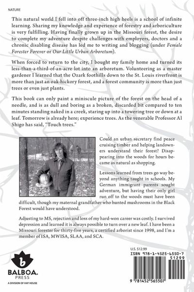 This natural world I fell into off three-inch high heels is a school of infinite learning. Sharing my knowledge and experience of forestry and arboriculture is very fulfilling. Having finally grown up in the Missouri forest, the desire to complete my adventure despite challenges with employers, doctors and a chronic disabling disease has led me to writing and blogging (under Female Forester Forever or Our Little Urban Arboretum). When forced to return to the city, I bought my family home and turned its less-than-a-third-of-an-acre lot into an arboretum. Volunteering as a master gardener I learned that the Ozark foothills down to the St. Louis riverfront is more than just an oak-hickory forest, and a forest community is more than just trees or even just plants. This book can only paint a miniscule picture of the forest on the head of a needle, and is as dull and boring as a broken, discarded bit compared to ten minutes standing naked in a creek, staring up into a towering tree or down at a leaf. Tomorrow is already here; experience trees. As the venerable Professor Al Shigo has said, "Touch trees."