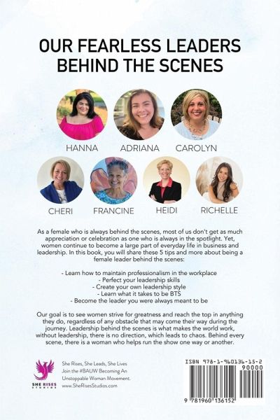 Female Leaders Behind the Scenes is a journey into the often unseen excellence responsible for many companies' success. Navigating the terrain of female leadership from the shadows demands a unique blend of resilience, ingenuity, and determination. In a world where the spotlight often fails to reach those working tirelessly behind the scenes, this book stands as a beacon of recognition and empowerment. Step into the realm of the uncelebrated, where the heartbeat of progress is driven by women who thrive in the background. Female Leaders Behind the Scenes offers an insightful exploration of the distinct challenges faced by these unsung heroines, while uncovering the invaluable wisdom they carry. From cultivating an aura of professionalism that commands respect to refining leadership skills that whisper authority, this guide delves deep into the art of shaping impactful influence. With an emphasis on crafting a leadership style that's uniquely your own, you'll find inspiration to embrace your authentic voice while paving your own path to success. This anthology of 7 powerful women from across the globe will help understand how to create an impact and have influence, without needing the spotlight. Learn to:Learn how to maintain professionalism in the workplace Perfect your leadership skills Create your own leadership style Learn what it takes to be BTS Become the leader you were always meant to be The book's mantra is "Behind every great success is a woman with conviction!" All chapters were authentically written and represent each author's intimate and relatable perspective on leadership outside of the spotlight and the power we have as women when we embrace it. As a female who is always behind the scenes, most of us don't get as much appreciation or celebration as one who is always in the spotlight. Yet, women continue to become a large part of everyday life in business and leadership. Join the founders, Hanna Olivas and Adriana Luna Carlos, as well as the other 5 amazing authors in Female Leaders Behind the Scenes:Adriana Luna Carlos Hanna Olivas Francine Juhlin Richelle Pena Carrie Wehunt Dr. Heidi Gregory-Mina Cheri Dixon She Rises Studios was founded by Hanna Olivas and Adriana Luna Carlos, the mother-daughter duo, in mid 2020 as they saw a need to help empower women around the world. They are the podcast hosts of She Rises Studios Podcast and the TV show hosts of Becoming An Unstoppable Woman, as well as Amazon best-selling authors and motivational speakers who travel the world. Hanna and Adriana are the movement creators of #BAUW - Becoming An Unstoppable Woman: The movement is to universally impact women of all ages, in whatever stage of life, to overcome insecurities, adversities, and develop an unstoppable mindset. She Rises Studios educates, celebrates, and empowers women globally.