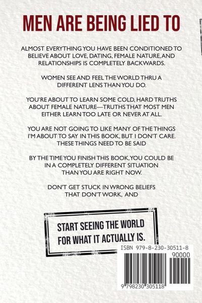 Almost everything you have been conditioned to believe about women, love, dating, and relationships is completely backwards. Most men are completely oblivious to how women think and operate in the dating world. And that's why most men are in the following categories: Rejected Frustrated Single Lonely Confused Stuck Sexless Invisible Powerless My goal is simple: to break down female nature to its core. I want you to understand how women see the world, how they view men, and how they operate when it comes to relationships. You're about to learn some cold, hard truths about women-truths that most men either learn too late or never at all. This information here isn't common knowledge, so take the time to absorb it, internalize it, and recognize that it might upset you at first because some are hard pills to swallow. But as you come to understand these things about female nature, you'll realize that this knowledge will set you free. It will help you have a much better time with women and have the relationships that you want on your own terms. A few things you'll learn in this book:How society lies to men about what attracts women Why you need to abandon logic when dealing with women 7 Uncomfortable Truths About Female Nature That Every Man Needs to Know Women are more similar than they are different What they say is typically the opposite of what they respond to The inverse relationship women have with attraction With women, the more you put in, the less you'll get out Your care, love, and validation is a turn-off and destroys desire What hypergamy is and how it dictates women's choices How attraction must be maintained at every stage of the relationship How women's sex drive works differently than yours How women manipulate men who don't know their worth Why putting yourself first makes you more attractive to women Women's attraction mechanisms are wired differently, and if you want to succeed with them, you need to think and act differently. This book is for the men who are ready to throw away all the preconceived notions, see things as they really are, and change their dating lives. I know you are not going to like many of the things I'm about to say in this book, but I don't care. These things need to be said. The reason why most men are struggling with women is because they are oblivious to this information and they are doing the wrong things. If you are able to stomach this information and put it into practice, you'll have the upper hand compared to the majority of men out there. Because you will be that one guy that "Gets it." This book applies to both initial attraction and long-term relationships. The game doesn't stop when you get that "boyfriend" tag or put a ring on her finger. Attraction, respect, and desire need to be maintained over time. You can't let your guard down just because you've slept with her a few times, moved in together, or you're married. Women don't see sex as the endgame like men do. Stop struggling with confusion, rejection, and frustration, and start understanding the game you're playing. Let's get some power back in this dating marketplace. Click 'Add to Cart' now and take the first step towards mastering your dating life.
