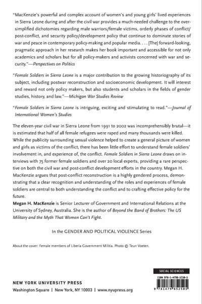The eleven-year civil war in Sierra Leone from 1991 to 2002 was incomprehensibly brutal-it is estimated that half of all female refugees were raped and many thousands were killed. While the publicity surrounding sexual violence helped to create a general picture of women and girls as victims of the conflict, there has been little effort to understand female soldiers' involvement in, and experience of, the conflict. Female Soldiers in Sierra Leone draws on interviews with 75 former female soldiers and over 20 local experts, providing a rare perspective on both the civil war and post-conflict development efforts in the country. Megan MacKenzie argues that post-conflict reconstruction is a highly gendered process, demonstrating that a clear recognition and understanding of the roles and experiences of female soldiers are central to both understanding the conflict and to crafting effective policy for the future.