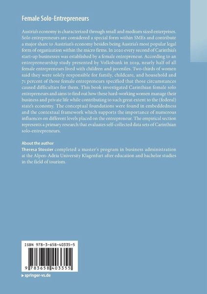 Austria's economy is characterized through small and medium sized enterprises. Solo entrepreneurs are considered a special form within SMEs and contribute a major share to Austrian's economy besides being Austria's most popular legal form of organization within the micro firms. In 2020 every second of Carinthia's start-up businesses was established by a female entrepreneur. According to an entrepreneurship study presented by Volksbank in 2019, nearly half of all female entrepreneurs lived with children and juveniles. Two-thirds of women said they were solely responsible for family, childcare, and household and 71 percent of those female entrepreneurs specified that those circumstances caused difficulties for them. This book investigated Carinthian female solo entrepreneurs and aims to find out how these hard-working women manage their business and private life while contributing to such great extent to the (federal) state's economy. The conceptual foundations were found in embeddednessand the contextual framework which supports the importance of numerous influences on different levels placed on the entrepreneur. The empirical section represents a primary research that evaluates self-collected data sets of Carinthian solo-entrepreneurs.