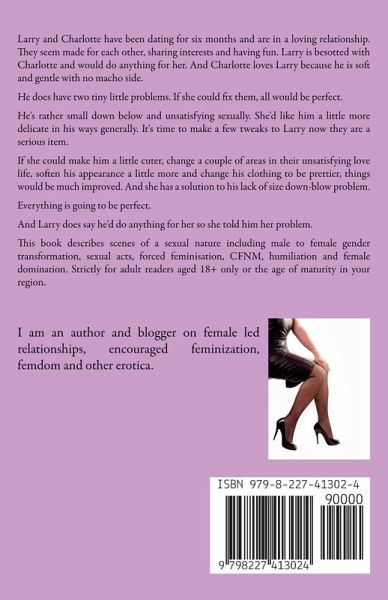 Larry and Charlotte have been dating for six months and are in a loving relationship. They seem made for each other, sharing interests and having fun. Larry is besotted with Charlotte and would do anything for her. And Charlotte loves Larry because he is soft and gentle with no macho side. He does have two tiny little problems. If she could fix them, all would be perfect. He's rather small down below and unsatisfying sexually. She'd like him a little more delicate in his ways generally. It's time to make a few tweaks to Larry now they are a serious item. If she could make him a little cuter, change a couple of areas in their unsatisfying love life, soften his appearance a little more and change his clothing to be prettier, things would be much improved. And she has a solution to his lack of size down-blow problem. Everything is going to be perfect. And Larry does say he'd do anything for her so she told him her problem. This book describes scenes of a sexual nature including male to female gender transformation, sexual acts, forced feminisation, CFNM, humiliation and female domination. Strictly for adult readers aged 18+ only or the age of maturity in your region.