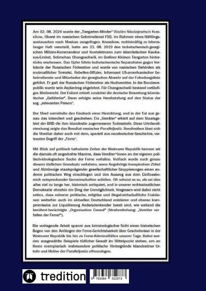 Am 02. 08. 2024 wurde der "Tiergarten-Mörder" Wadim Nikolajewitsch Krassikow, Oberst des russischen Geheimdienstes FSB, im Rahmen eines Häftlingsaustausches nach Moskau ausgeflogen. Krassikow, rechtskräftig zu lebenslanger Haft verurteilt, hatte am 23. 08. 2019 den tschetschenisch-georgischen Milizen-Kommandeur und mutmaßlichen Unterstützer des islamistischen Kaukasus-Emirats, Selimchan Changoschwili, im Berliner Kleinen Tiergarten hinterrücks erschossen. Das Opfer kommandierte tschetschenische Separatisten gegen Verbände der Russischen Föderation und wurde von russischen Behörden als mutmaßlicher Terrorist, Rebellen-Offizier, Informant US-amerikanischer Geheimdienste und Mitarbeiter georgischer Sicherheitsbehörden auf der Fahndungsliste geführt. Er galt der Russischen Föderation als Hochverräter. In der Bundesrepublik wurde sein Asylantrag abgelehnt. Für Changoschwili bestand ein vorläufiges Bleiberecht. Der Exilant erhielt zunächst die deutsche Bewertung islamistischer "Gefährder", dann erfolgte seine Herabstufung auf den Status einer sog. "relevanten Person". Zeugen vor Ort hatten den Eindruck einer "Hinrichtung". Und in der Tat war genau das intendiert und geschehen: Ein "Verräter" erhielt auf dem Staatsgebiet der BRD die ihm klandestin zugemessene Todesstrafe. Diese Urteilsvollstreckung zeigte das Resultat russischer Paralleljustiz. Beschreiben lässt sich der Anschlag daher auch mit dem, speziell aus deutscher Geschichte, vertrauten Begriff der "Feme". Mit Blick auf politisch turbulente Zeiten der Weimarer Republik kennen wir die damals oft angedrohte Maxime, dass Verräter_innen an der eigenen politisch-ideologischen Sache der Feme verfallen. Und oft genug wurde nach genau diesem tödlichen Grundsatz verfahren, wenn Angehörige konspirativer Zirkel und Abtrünnige des herrschenden Regimes einen anderen politischen Weg einschlugen und den Ausstieg aus radikalgesinnten Gruppierungen wählten. Oft scheint es so, als sei dies alles viel zu lange her, historisch antiquiert, und in unserer rechtsstaatlichen Demokratie ohnehin ein Ding der Unmöglichkeit. Vergessen wird dabei oft, dass extreme politische, religiöse und illegal-ökonomische Fraktionen nach wie vor auch im aktuellen Deutschland existieren und ebenso kompromisslos zur Liquidierung Andersdenkender bereit sind, wie weiland die berühmt-berüchtigte "Organisation Consul" (Credo: "Verräter verfallen der Feme!"). Die vorliegende Arbeit möchte aus kriminologischer Sicht einen historischen Bogen spannen von den Anfängen der Feme-Gerichtsbarkeit über die Geschehnisse in der Weimarer Republik bis hin zu Feme-Kriminalfällen unserer Tage. Dabei werden ausgewählte Beispiele tödlicher Gewalt im Mittelpunkt stehen, um an ihnen exemplarisch insbesondere politische Hintergründe klandestiner Urteile und Motive der Paralleljustiz offenzulegen. Tiefergehende Diskussion finden somit gerade auch historisch-politische Rahmenbedingungen, soweit sie gravierend auf Handlungen der Tatausübenden und Feme-Opfer einwirken.