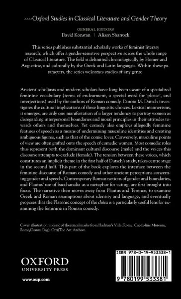 As literature written in Latin has almost no female authors, we are dependent on male writers for some understanding of the way women would have spoken. Plautus (3rd to 2nd century BCE) and Terence (2nd century BCE) consistently write particular linguistic features into the lines spoken by their female characters: endearments, soft speech, and incoherent focus on numerous small problems. Dorota M. Dutsch describes the construction of this feminine idiom and asks whether it should be considered as evidence of how Roman women actually spoke.