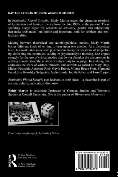 In Femininity Played Straight, Biddy Martin traces the changing relations of lesbianism and feminist theory from the late 1970s to the present. These sparkling essays argue for accounts of sexuality, gender and subjectivity that make lesbianism intelligible and important, for lesbians and non-lesbians alike. Moving between theoretical and autobiographical modes, Biddy Martin brings different kinds of writing to bear upon one another. At a theoretical level, her work takes issue with postmodern theory, defending instead the role of psychoanalytic criticism. She argues for the continued validity of critical modes that do not abandon the unconscious in seeking to understand the relation of subjectivity to language. In so doing, she addresses the work of writers, thinkers and activists as varied as Mary Daly, Michel Foucault, Adrienne Rich, Gayle Rubin, Minnie Bruce Pratt, Sigmund Freud, Eve Kosofsky Sedgwick, Audre Lorde, Judith Butler, and Joan Copjec.