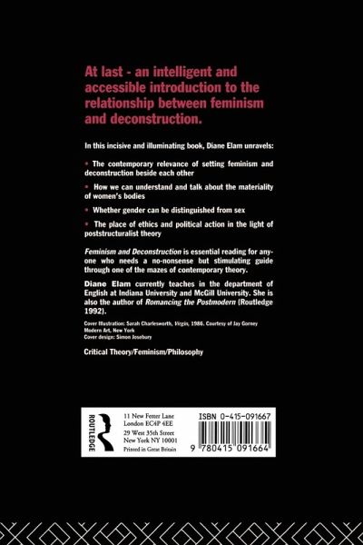 At last - an intelligent and accessible introduction to the relationship between feminism and deconstruction. In this incisive and illuminating book, Diane Elam unravels: * the contemporary relevance of feminism and deconstruction * how we can still understand and talk about the materiality of women's bodies * whether gender can be distinguished from sex * the place of ethics and political action in the light of postmodernist theory. Clearly and brilliantly written, Feminism and Deconstruction is essential reading for anyone who needs a no-nonsense but stimulating guide through one of the mazes of contemporary theory.