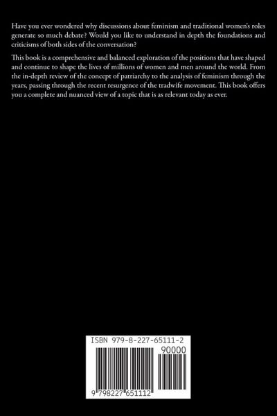 Have you ever wondered why discussions about feminism and traditional women's roles generate so much debate? Would you like to understand in depth the foundations and criticisms of both sides of the conversation? If so, I am pleased to introduce you to this recent book: "Feminism and its Criticisms of Traditional Wives." This book is not just another work on feminism; it is a comprehensive and balanced exploration of the positions that have shaped and continue to shape the lives of millions of women and men around the world. From the in-depth review of the concept of patriarchy to the analysis of feminism through the years, passing through the recent resurgence of the tradwife movement (traditional wives), this book offers you a complete and nuanced view of a topic that is as relevant today as ever. What will you find in this book? A critical review of patriarchy: Explore how the concept of patriarchy has been interpreted and applied throughout history, from its origin to its influence on contemporary society. You will understand why some consider it the root of women's oppression, while others see it as a sociocultural construction that has been distorted. Feminism through the years: From the suffragettes to the fourth wave of feminism, this book traces the evolution of feminism, its achievements, and its controversies. Understand how feminism has changed women's lives, and the criticisms it has faced at each stage. The tradwife movement: An in-depth analysis of the movement of traditional wives, who voluntarily choose to assume domestic and submissive roles, defending a lifestyle based on conservative values. Is this movement a reaction to feminism or a legitimate expression of personal freedom? Cross-criticisms: Learn the arguments that feminists raise against the traditional model of the wife and how tradwives respond to these criticisms. Can a modern woman choose a traditional role without being seen as a traitor to the feminist cause? This book explores the tensions and convergences between both positions. Why should you read it? Balanced perspective: We do not take sides, but rather provide a platform for both views to present their arguments. Academic rigor: Based on research and reliable sources, this book provides a serious and well-founded analysis of complex issues. Current relevance: At a time when discussions about gender and roles are at the center of public debate, this book is essential for anyone who wants to understand the roots and ramifications of these discussions. "Feminism and its Criticisms of Traditional Wives" is a book for those seeking clarity in a sea of ¿¿opinions and for those who wish to understand the whys and wherefores of the positions that divide and unite women and men today. Don't miss the opportunity to enrich your understanding of a crucial issue for our society. Click here to get your copy today and dive into a debate that defines our times!
