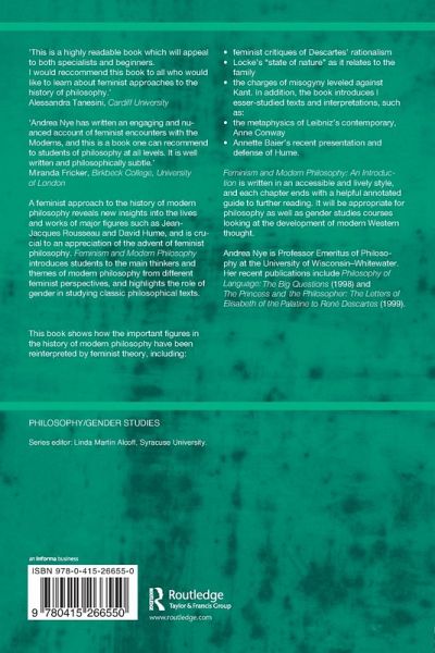 The history of modern philosophy is a major topic in philosophy and is crucial to an understanding of the advent of feminist philosophy. "Feminism and Modern Philosophy" introduces fundamental topics in modern philosophy from a feminist perspective. It takes the student through the subject step by step by looking at the main thinkers most usually examined on a course in modern philosophy and by examining the role of gender in studying classic philosophical texts. The book covers the following structure looking at the ideas and work of the important thinkers in this period: * Rereading the canon * The attack on modernist philosophical reason * The nature of "Man" * The search for male allies * Discovering women philosophers * Are there universal philosophical truths? * The function of history within the discipline of philosophy Each chapter looks closely at the way in which the traditional philosophical canon has been re-interpreted by feminist theory and examines the implications for our interpretation of specific texts. It looks at, for example: * A feminist critique of Cartesian rationalism * The implications of Locke's state of nature for the idea of the family * An appreciation of Hume's unique "collaboration" with Annette Baier Chapters close with a summary and the book contains an extensive annotated bibliography. Andrea Nye's style is student friendly and will be ideal for anyone coming to the topic for the first time. It will be appropriate for philosophy as well as gender studies courses looking at the development of modern Western thought.