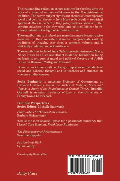 1. Introduction: Beyond the Politics of Gender: Seyla Benhabib and Drucilla Cornell. 2. Feminism and Marx: Integrating Kinship with the Economic: Linda Nicholson. 3. What's Critical about Critical Theory? - The Case of Habermas and Gender: Nancy Fraser. 4. Impartiality and the Civic Public: Some Implications of Feminist Critiques of Moral and Political Theory: Iris Marion Young. 5. The Generalized and the Concrete Other: The Kohlberg-Gilligan Controversy and Feminist Theory: Seyla Benhabib. 6. Women, Success, and Civil Society: Submission to, or Subversion of, the Achievement Principle: Maria Markus. 7. Disciplining Women: Michel Foucault and the Power of Feminist Discourse: Isaac D. Balbus. 8. Variations on Sex and Gender: Beauvoir, Witting, and Foucault: Judith Butler. 9. Feminism, Negativity, Intersubjectivity: Drucilla Cornell and Adam Thurschwell. Notes on Contributors.