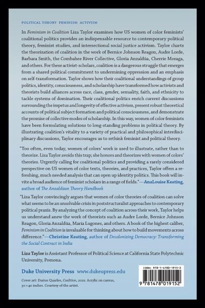 In Feminism in Coalition Liza Taylor examines how US women of color feminists' coalitional politics provides an indispensable resource to contemporary political theory, feminist studies, and intersectional social justice activism. Taylor charts the theorization of coalition in the work of Bernice Johnson Reagon, Audre Lorde, Barbara Smith, the Combahee River Collective, Gloria Anzaldúa, Cherríe Moraga, and others. For these activist-scholars, coalition is a dangerous struggle that emerges from a shared political commitment to undermining oppression and an emphasis on self-transformation. Taylor shows how their coalitional understandings of group politics, identity, consciousness, and scholarship have transformed how activists and theorists build alliances across race, class, gender, sexuality, faith, and ethnicity to tackle systems of domination. Their coalitional politics enrich current discussions surrounding the impetus and longevity of effective activism, present robust theoretical accounts of political subject formation and political consciousness, and demonstrate the promise of collective modes of scholarship. In this way, women of color feminists have been formulating solutions to long-standing problems in political theory. By illustrating coalition's vitality to a variety of practical and philosophical interdisciplinary discussions, Taylor encourages us to rethink feminist and political theory.