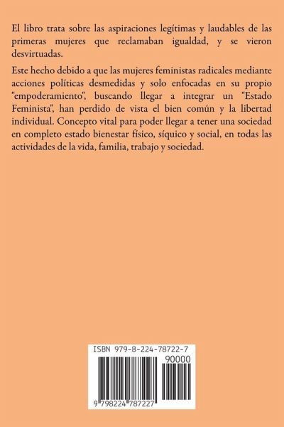 El libro trata sobre las aspiraciones legítimas y laudables de las primeras mujeres que reclamaban igualdad, y se vieron desvirtuadas. Este hecho debido a que las mujeres feministas radicales mediante acciones políticas desmedidas y solo enfocadas en su propio "empoderamiento", buscando llegar a integrar un "Estado Feminista", han perdido de vista el bien común y la libertad individual. Concepto vital para poder llegar a tener una sociedad en completo estado bienestar físico, síquico y social, en todas las actividades de la vida, familia, trabajo y sociedad.