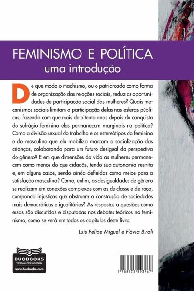 Em Feminismo e política: uma introdução, os cientistas políticos Flávia Biroli e Luis Felipe Miguel discutem as principais contribuições da teoria política feminista produzida a partir dos anos 1980 e apresentam os termos em que os debates se colocam dentro do próprio feminismo, mapeando as posições de diferentes autoras e correntes. O resultado é um panorama inédito do feminismo atual, escrito de maneira a introduzir os leitores pouco familiarizados nas discussões, sem por isso reduzir sua complexidade.Ao longo de dez capítulos, os autores abordam temas como a prostituição e o aborto, a representação política e a opressão sofrida pelas mulheres. Embasado em nomes reconhecidos da teoria feminista, como Carole Pateman e Nancy Fraser, Feminismo e política enriquece e amplia o debate sobre um dos movimentos mais discutidos na sociedade atual.'Nos tempos sombrios em que alguns anunciam a morte do feminismo e outros esbravejam nada dever a essa corrente teórico-política, o livro de Luis Felipe Miguel e de Flávia Biroli aparece como um raio de sol', afirma a pesquisadora Renata Gonçalves, da Universidade Federal de São Paulo. 'Apontar as desigualdades ajuda a entender por que, apesar dos direitos conquistados nas últimas décadas, as mulheres permanecem 'excluídas da política' e continuam a ser o grupo de maior vulnerabilidade'.Nas lutas pelo voto feminino e pelo acesso das mulheres à educação, assim como na exigência de direitos iguais no casamento e do direito ao divórcio, do direito das mulheres à integridade física e a controlar sua capacidade reprodutiva, o feminismo pressionou os limites da ordem estabelecida. O livro mostra como o debate sobre a posição das mulheres nas sociedades contemporâneas abriu portas para questionar as categorias centrais por meio das quais é pensado o universo da política, tais como as noções de indivíduo, de espaço público, de autonomia, de igualdade, de justiça e de democracia. 'As relações de gênero atravessam toda a sociedade, e seus sentidos e seus efeitos não estão restritos às mulheres. O gênero é, assim, um dos eixos centrais que organizam nossas experiências no mundo social. Onde há desigualdades que atendem a padrões de gênero, ficam definidas também as posições relativas de mulheres e de homens - ainda que o gênero não o faça isoladamente, mas numa vinculação significativa com classe, raça e sexualidade', escrevem os autores na introdução do livro.