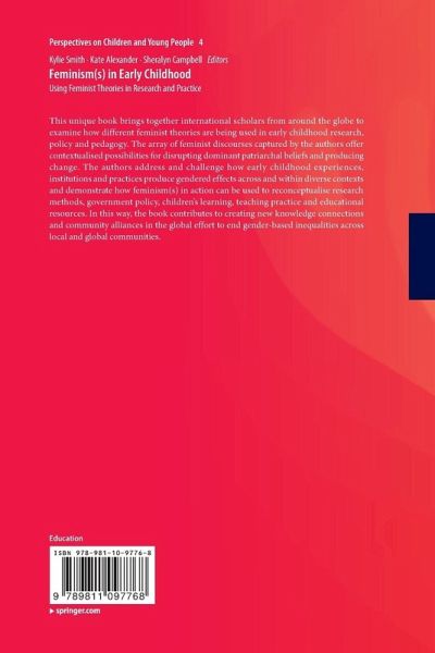 Foreword.- Chapter 1 Introduction.- Section I: Feminism(s) reconceptualising histories.- Chapter 2 Feminism and the Development of Early Childhood Education in Australia.- Chapter 3 The Didgeridoo, and Instrument of Oppression or Decolonisation?.- Chapter 4 Celebrating Pioneering and Contemporary Feminist Approaches to the Study of Gender in Early Childhood.- Chapter 5 Black Feminist Thought in Early Childhood Studies: (Re)Centering Marginalized Feminist Perspectives.- Section II: Feminism(s) reconceptualising institutions.- Chapter 6 The Entangled Enlivening of Being: Feminist Research Strategies in the Early Years.- Chapter 7 Enhancing Feminism and Childhoods in Kenya through Stronger Education Policy, Access and Action.- Chapter 8 What's wrong with Equality? Developing a Critical Conceptual Understanding of Equality of condition in Early Childhood Education and Care.- Chapter 9 Love and the Nuclear Family in the Kindergarten: Critical Analyses of Heteronormativities.- SectionIII: Feminism(s) reconceptualising practice.- Chapter 10 Time and Relationship: Paternal and Maternal Tensions in Teacher Narratives.- Chapter 11 Engaging with Feminist Poststructuralism to inform Gender Equity Practice in Early Childhood Classrooms in Pakistan.- Chapter 12 Feminism and Early Childhood Education in Indonesia: Teachers' Reflections.- Chapter 13 Gender Identities in the Australian Early Years Learning Framework.- Chapter 14 Are we there yet? Gender Equity Journeys in Early Childhood Practice.