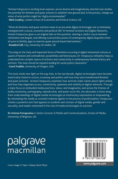 This book sheds new light on the way that, in the last decade, digital technologies have become inextricably linked to culture, economy and politics and how they have transformed feminist and queer activism. This exciting text critically analyses the contradictions, tensions and often-paradoxical aspects that characterize such politics, both in relation to identity and to activist practice. Aristea Fotopoulou examines how activists make claims about rights online, and how they negotiate access, connectivity, openness and visibility in digital networks. Through a triple focus on embodied media practices, labour and imaginaries, and across the themes of bodily autonomy, pornography, reproduction, and queer social life, she advocates a move away from understandings of digital media technologies as intrinsically exploitative or empowering. By reinstating the media as constant material agents in the process of politicization, Fotopoulou creates a powerful text that appeals to studentsand scholars of digital media, gender and sexuality, and readers interested in the role of media technologies in activism.