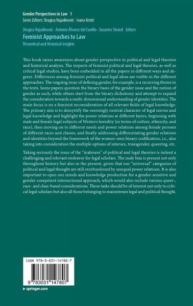 This book raises awareness about gender perspective in political and legal theories and historical analysis. The impacts of feminist political and legal theories, as well as critical legal studies, have been embedded in all the papers in different ways and degrees. Differences among feminist political and legal ideas are visible in the different approaches. The ongoing issue of defining gender, for example, is a recurring theme in the texts. Some papers question the binary basis of the gender issue and the notion of gender as such, while others start from the binary dichotomy and attempt to expand the consideration towards a multi-dimensional understanding of gender identities. The main focus is on a feminist reconsideration of all relevant fields of legal knowledge. The primary aim is to demystify the seemingly neutral character of legal norms and legal knowledge and highlight the power relations at different layers, beginning with male and female legal subjects of Western heredity (in terms of culture, ethnicity, and race), then moving on to different needs and power relations among female persons of different races and classes, and finally addressing differentiating gender relations and identities beyond the framework of the women-men binary codification, i.e., also taking into consideration the multiple options of intersex, transgender, queering, etc.