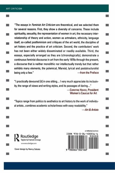 From the Preface:"The essays in Feminist Art Criticism are theoretical, and we selected them for several reasons. First, they show a diversity of concerns. These include spirituality, sexuality, the representation of women in art, the necessary inter-relationship of theory and action, women as artmakers, ethnicity, language itself, so-called postfeminism and critiques of hte art world, the discipline of art history and the practice of art criticism. Second, the contributors' work has not been either widely disseminated or readily available. Third, the essays, especially arranged as they are (chronologically), demonstrate a continuous feminist discourse in art from the early 1970s through the present, a discourse that is neither monolithic nor intellectually trendy but that rather exhibits many elements, the polemical, Marxist, lyrical, and poststructuralist being only a few."
