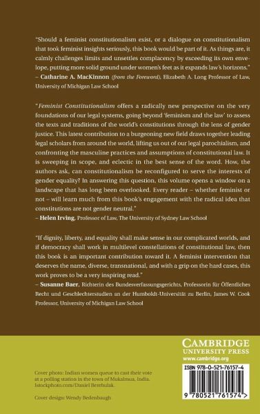 Part I. Feminism as a Challenge to Constitutional Theory: 1. Rethinking constitutionalism through the lens of the gendered division of household labour Jennifer Nedelsky; 2. Feminist fundamentalism and the constitutionalization of marriage Mary Anne Case; 3. Abortion, dignity, and a capabilities approach Rosalind Dixon and Martha Nussbaum; Part II. Feminism and Judging: 4. Her-meneutics: feminism and interpretation Daphne Barak-Erez; 5. Intuition and feminist constitutionalism Suzanne Goldberg; 6. Women judges, 'maiden speeches', and the high court of Australia Heather Roberts; 7. Will 'watertight compartments' sink women's charter rights? The need for a new theoretical approach to women's multiple rights claims under the Canadian Charter of Rights and Freedoms Kerri Froc; 8. Constitutional adjudication and substantive gender equality in Hong Kong Kelley Loper; Part III. Feminism, Democracy and Political Participation: 9. The gendered state and women's political leadership: explaining the American puzzle Eileen McDonagh and Paula A. Monopoli; 10. On parity, independence, and women's democracy Blanca Rodriguez-Ruiz and Ruth Rubio-Marin; 11. Women's involvement in international constitution-making Elizabeth Katz; 12. Between constitutional jurisdiction and women's rights organizations: women, war, and the space of justice in Colombia Carolina Vergel Tovar; 13. The promise of democratic constitutionalism: women, constitutional dialogue, and the Internet Tsvi Kahana and Rachel Stephenson; Part IV. The Constitutionalism of Reproductive Rights: 14. Pregnancy, equality, and U.S. constitutional law Jennifer S. Hendricks; 15. Federal spending and compulsory maternity Nicole Huberfeld; 16. Challenges for contemporary reproductive rights advocacy: the South African example Rachel Rebouché; Part V. Women's Rights, Multiculturalism, and Diversity: 17. Constitutional rights of women under customary law in Southern Africa: dominant interventions and 'old pathways' Chuma Himonga; 18. Minority women: a struggle for equal protection against domestic violence Puja Kapai; 19. Watch GRACE grow: African customary law and constitutional law in the equality garden Jewel Amoah; 20. Critical multiculturalism Vrinda Narain; 21. Democratic theory, feminist theory, and constitutionalism: the challenge of multiculturalism Susan H. Williams; Part VI. Women between Secularism and Religion: 22. Secular constitutionalism and Muslim women's rights: the Turkish headscarf controversy and its impact on the European Court of Human Rights Hilal Elver; 23. On God, promises, and money: Islamic divorce at the crossroads of gender and the law Pascale Fournier; 24. Polygamy and feminist constitutionalism Beverley Baines.