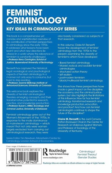 "It is a commendable achievement to have packed so much into such a short space without losing the flavour of debate, the demands of interdisciplinarity, and the tension and challenge that feminist informed work has posed, and continues to pose for criminology. Renzetti's accomplishment in this regard is remarkable. More importantly, what a student would get from this book is an appreciation of the relationship between different theoretical perspectives, how they might make different sense of the data and then might, as a consequence, result in different explanations. Renzetti also offers a view on where criminology might benefit in the future from its further engagement with feminists' concerns... This is a book that should be on any reading list that claims to be interested in feminist criminology. It is thoughtful and thought provoking and will provide an excellent platform from which to develop deeper understandings of the issues that it raises."