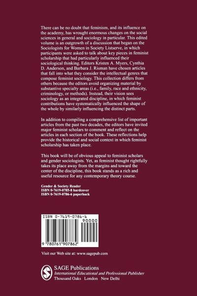 There can be no doubt that feminism has wrought enormous changes on the social sciences in general and sociology in particular. The contributors to this volume were asked to write about key pieces of feminist scholarship that had particularly influenced their sociological thinking. In addition, the editors invited major feminist scholars to comment and reflect upon the articles in each section. Rather than organizing the book by substantive subject areas, the editors' vision sees sociology as an integrated discipline where feminist contributions have influenced the shape of the whole by similarly influencing the distinct parts.