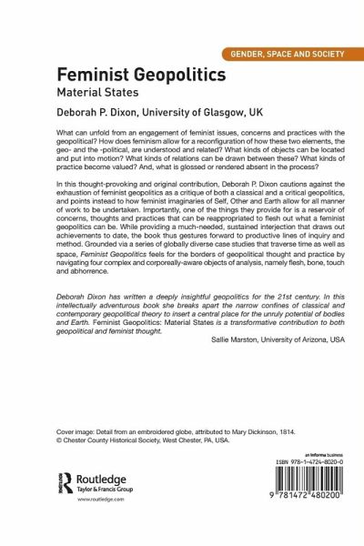What can unfold from an engagement of feminist issues, concerns and practices with the geopolitical? How does feminism allow for a reconfiguration of how these two elements, the geo- and the -political, are understood and related? What kinds of objects can be located and put into motion? What kinds of relations can be drawn between these? What kinds of practice become valued? And, what is glossed or rendered absent in the process? In this thought-provoking and original contribution, Deborah P. Dixon cautions against the exhaustion of feminist geopolitics as a critique of both a classical and a critical geopolitics, and points instead to how feminist imaginaries of Self, Other and Earth allow for all manner of work to be undertaken. Importantly, one of the things they provide for is a reservoir of concerns, thoughts and practices that can be reappropriated to flesh out what a feminist geopolitics can be. While providing a much-needed, sustained interjection that draws out achievements to date, the book thus gestures forward to productive lines of inquiry and method. Grounded via a series of globally diverse case studies that traverse time as well as space, Feminist Geopolitics feels for the borders of geopolitical thought and practice by navigating four complex and corporeally-aware objects of analysis, namely flesh, bone, touch and abhorrence.