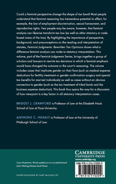 Could a feminist perspective change the shape of tax laws? Feminist reasoning and analysis are recognized as having tremendous potential to affect employment discrimination, sexual harassment, and reproductive rights laws - but they can likewise transform tax law (as well as other statutory or code-based areas of the law). By highlighting the importance of perspective, background, and preconceptions on reading and interpreting statutes, this volume shows what a difference feminist analysis can make to statutory interpretation. Feminist Judgments: Rewritten Tax Opinions brings together a group of scholars and lawyers to rewrite tax decisions in which a feminist emphasis would have changed the outcome, the court's reasoning, or the future direction of the law. Featuring cases including medical expense deductions for fertility treatment, gender confirmation surgery, tax benefits for married individuals, the tax treatment of tribal lands, and business expense deductions, this volume opens the way for a discussion of how viewpoint is a key factor in statutory interpretation.