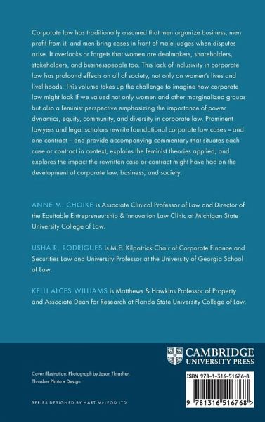 Corporate law has traditionally assumed that men organize business, men profit from it, and men bring cases in front of male judges when disputes arise. It overlooks or forgets that women are dealmakers, shareholders, stakeholders, and businesspeople too. This lack of inclusivity in corporate law has profound effects on all of society, not only on women's lives and livelihoods. This volume takes up the challenge to imagine how corporate law might look if we valued not only women and other marginalized groups, but also a feminist perspective emphasizing the importance of power dynamics, equity, community, and diversity in corporate law. Prominent lawyers and legal scholars rewrite foundational corporate law cases, and also provide accompanying commentary that situates each opinion in context, explains the feminist theories applied, and explores the impact the rewritten opinion might have had on the development of corporate law, business, and society.