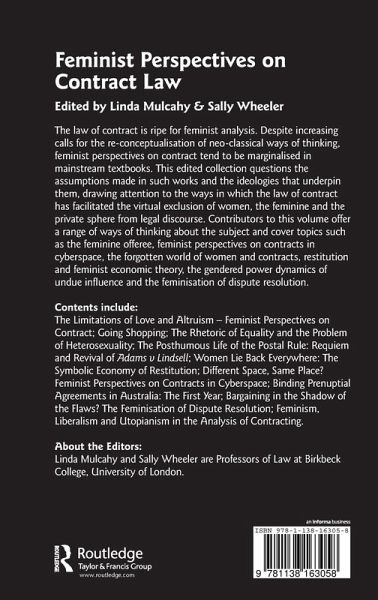 This edited collection questions the assumptions about feminist perspectives on contract law made in mainstream textbooks and the ideologies that underpin them, drawing attention to the ways in which the law of contract has facilitated the virtual exclusion of women, the feminine and the private sphere from legal discourse.