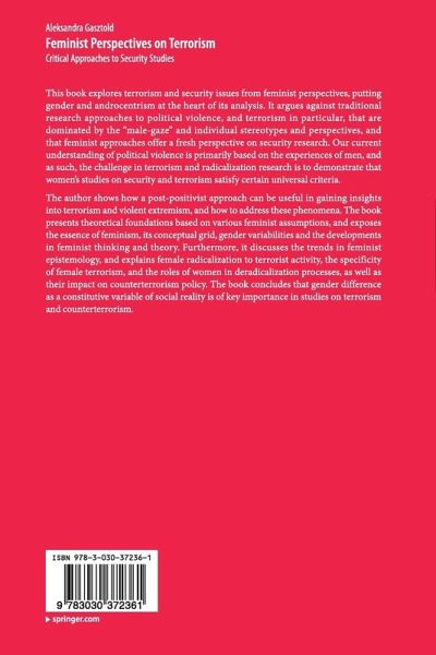 This book explores terrorism and security issues from feminist perspectives, putting gender and androcentrism at the heart of its analysis. It argues against traditional research approaches to political violence, and terrorism in particular, that are dominated by the "male-gaze" and individual stereotypes and perspectives, and that feminist approaches offer a fresh perspective on security research. Our current understanding of political violence is primarily based on the experiences of men, and as such, the challenge in terrorism and radicalization research is to demonstrate that women's studies on security and terrorism satisfy certain universal criteria. The author shows how a post-positivist approach can be useful in gaining insights into terrorism and violent extremism, and how to address these phenomena. The book presents theoretical foundations based on various feminist assumptions, and exposes the essence of feminism, its conceptual grid, gender variabilities and the developments in feminist thinking and theory. Furthermore, it discusses the trends in feminist epistemology, and explains female radicalization to terrorist activity, the specificity of female terrorism, and the roles of women in deradicalization processes, as well as their impact on counterterrorism policy. The book concludes that gender difference as a constitutive variable of social reality is of key importance in studies on terrorism and counterterrorism.