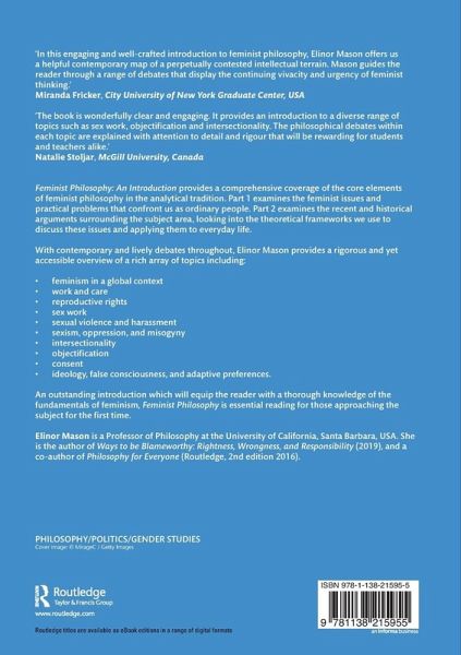 "In this engaging and well-crafted introduction to feminist philosophy, Elinor Mason offers us a helpful contemporary map of a perpetually contested intellectual terrain. Mason guides the reader through a range of debates that display the continuing vivacity and urgency of feminist thinking." - Miranda Fricker, City University of New York Graduate Center, USA