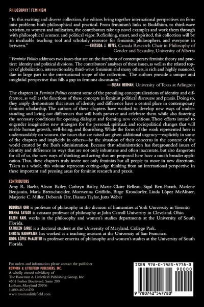 This anthology of articles provides contemporary international feminist perspectives on issues of identity, agency, and difference as they pertain to both feminist politics in particular, and contemporary western politics more generally.